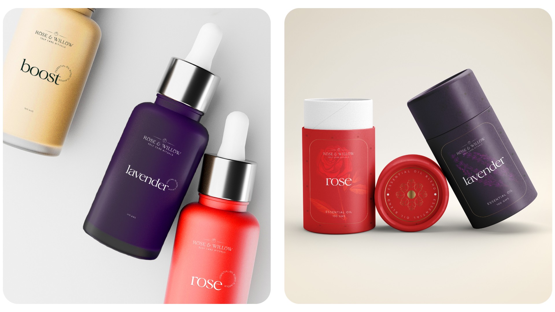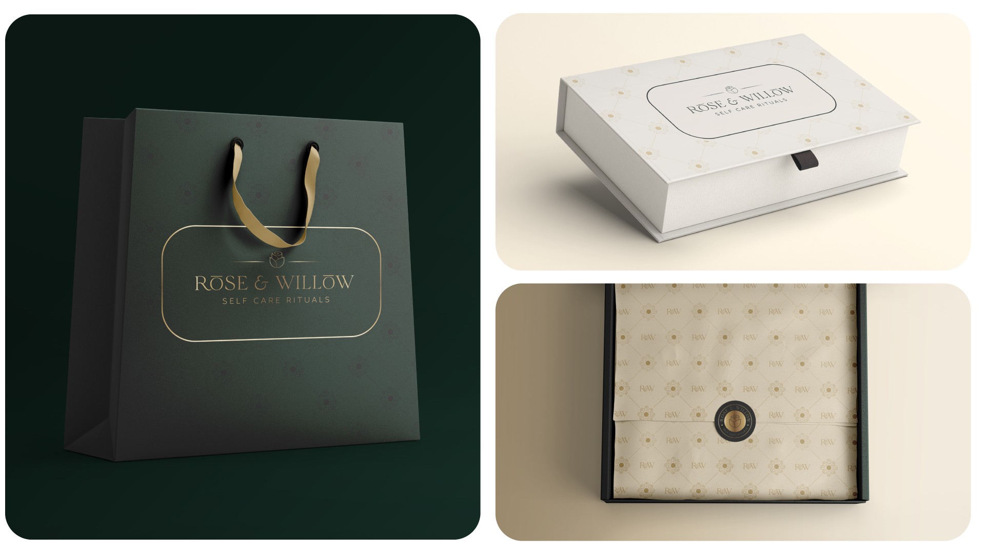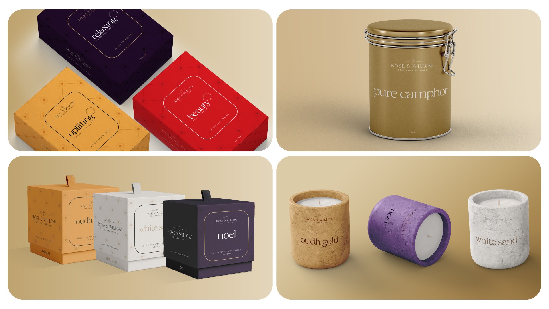 Rose & Willow is a brand dedicated to creating personal rituals — candles, essential oils, perfumes, incense sticks. The brief was to build an identity that felt both tranquil and sophisticated, and packaging that communicated the experience before the product was even opened. I developed the complete brand identity and packaging system — logomark, colour palette, typography, illustration style, and a cohesive packaging suite across all product lines.