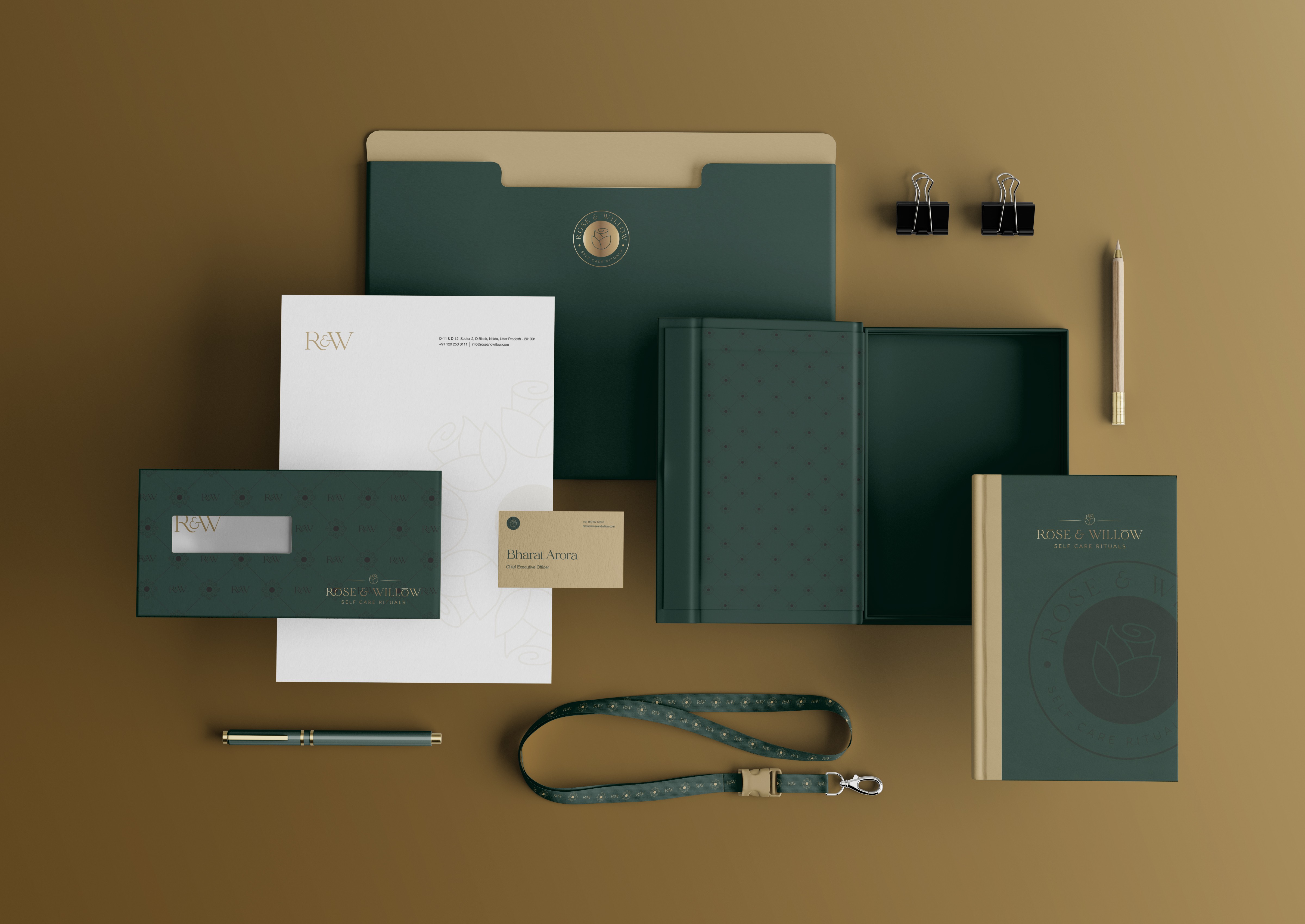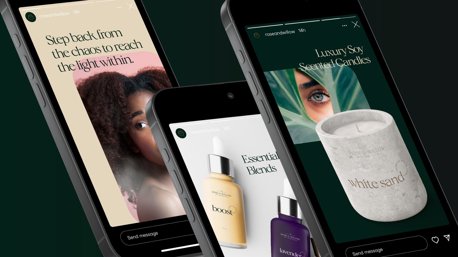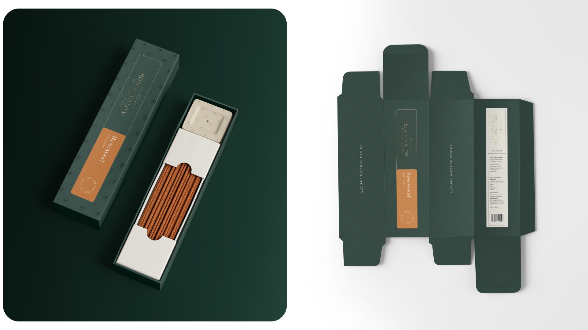 Rose & Willow is a brand dedicated to creating personal rituals — candles, essential oils, perfumes, incense sticks. The brief was to build an identity that felt both tranquil and sophisticated, and packaging that communicated the experience before the product was even opened. I developed the complete brand identity and packaging system — logomark, colour palette, typography, illustration style, and a cohesive packaging suite across all product lines.